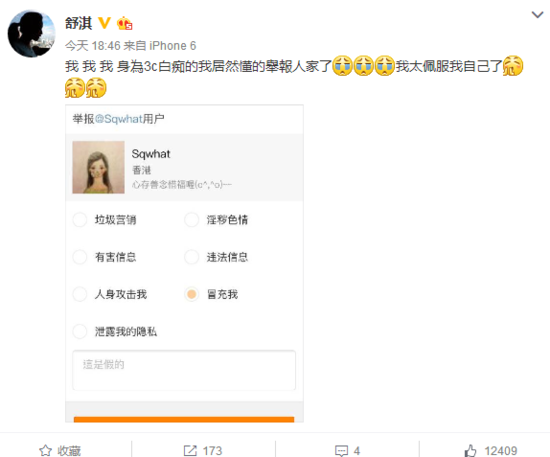 7月14日晚,舒淇通过微博举报冒充她小号的网友,并为自己点赞: “身为3c白痴的我,居然懂的举报人家了,我太佩服我自己了!”舒淇在微博中指名为“Sqwhat”的网友冒充她,并维护自身权益。